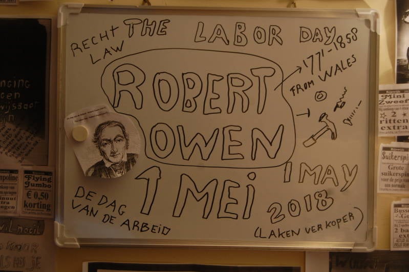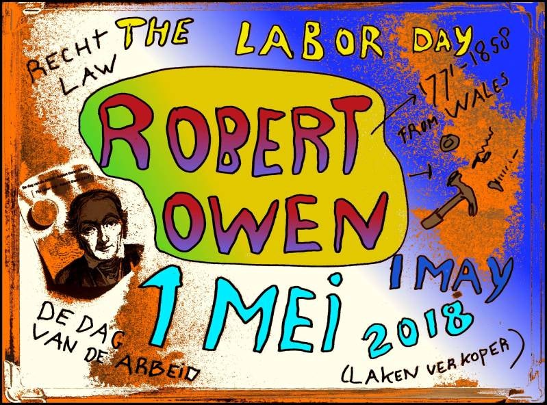 Hieronder ben ik uitgegaan van de dag 1 MEI 2018. Na een klein onderzoek kwam ik achter veel dingen van deze bijzondere dag van de arbeid die natuurlijk een ontstaansverhaal kent. Ik had echter zelf nog nooit van Robert Owen gehoord, maar met zo'n klein overzicht, maak ik veel duidelijk van wat ik op 1 mei 2018 te weten ben gekomen. De tekening is voor mezelf een belangrijke geheugensteun geworden.